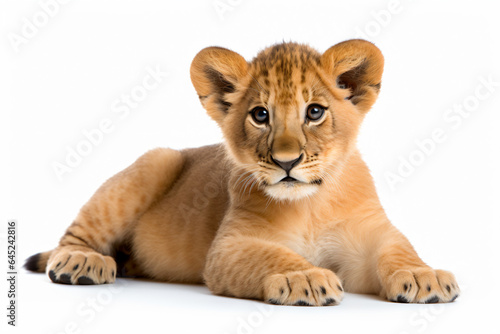 © illustrativeinfinity, Fototapeta premium a lion cub is laying down on a white surface