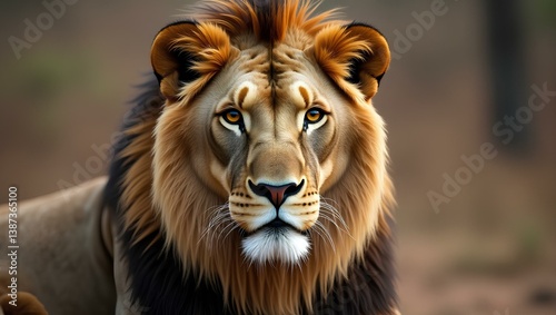 © Mena Bakhet, Obraz premium A lion displaying a big head and a lush mane, embodying strength and majesty in its natural habitat
