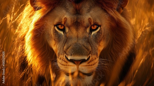 © Maxim Borbut, Naklejka premium A lion in the grass HD 8K wallpaper stock photo