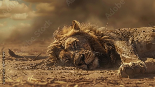 © Sarbinaz Mustafina, Naklejka premium A lion is laying down in the desert
