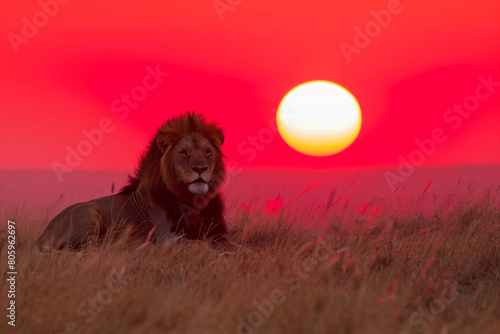 Fototapeta premium A lion is resting on a on dry grass in savannah at red sunset