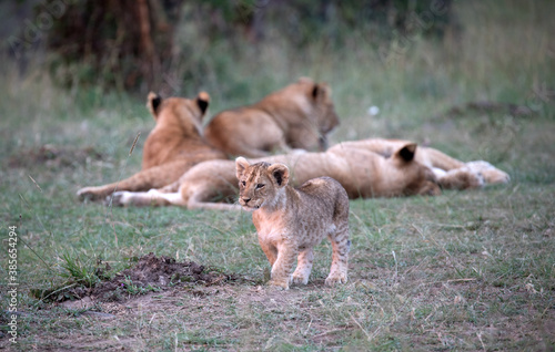 © Grantat, Fototapeta premium A Lion (panthers leo) with cubs in the early evening in northern Kenya.
