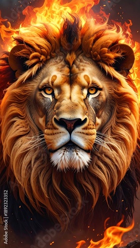 © Karina, Fototapeta premium A lion's face engulfed in flames