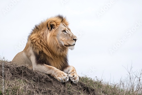 © Ева Поликарпова, Obraz premium A lion sits atop a lush green hill, offering a serene view