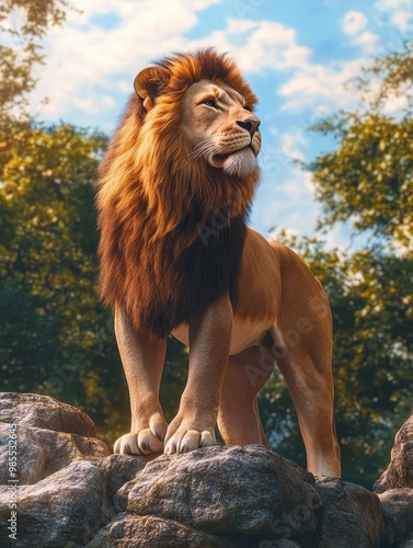 © K silver, Naklejka premium A lion stands on a rock in a forest