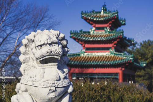 © Jared, Fototapeta premium A Lion Statue Keeps Watch over an Asian-Style Building at Robert D. Ray Asian Gardens in Des Moines, Iowa