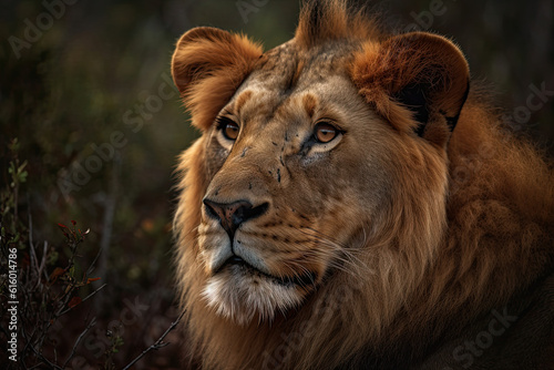 © Golib Tolibov, Obraz premium a lion that is looking at the camera with its head turned to look like he's thinking about something