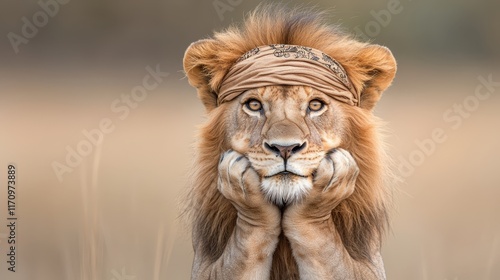 © Albert, Obraz premium A lion with a bandana on its head in a field