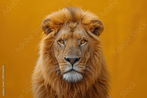 © Tik, Fototapeta premium A lion with a golden mane stands in front of a yellow background