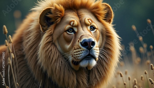 © vvicca, Fototapeta premium A lion with a long mane and a big nose is staring at the camera