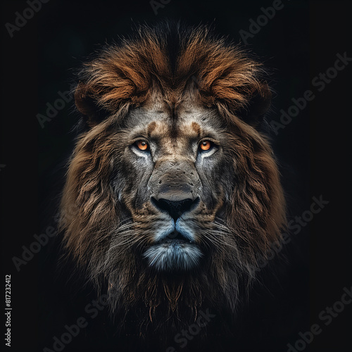 © Visual Craft, Fototapeta premium A lion with a long mane and a golden eye stares at the camera