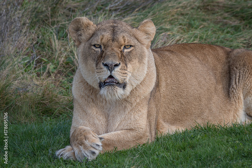 © alan1951, Obraz premium A lioness lying and relaxing on the grass with her paws crossed and staring forward