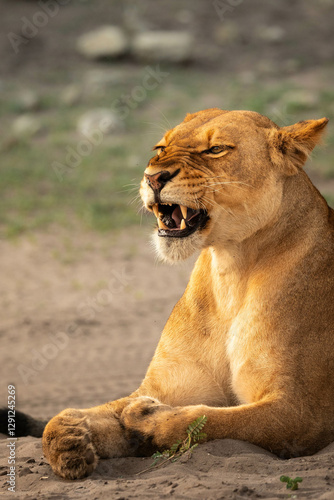 © Sjors, Naklejka premium A lioness showing her teeth and growling in a defensive posture, emphasizing her powerful and fierce nature.