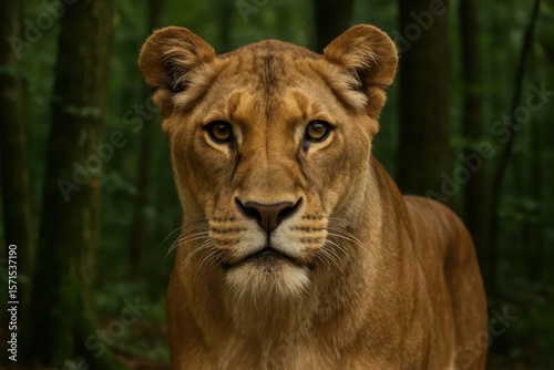 Naklejka premium A lioness stands poised in the heart of a verdant forest, her gaze steady and...