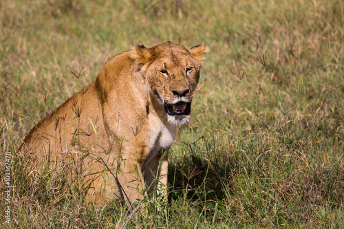Naklejka premium A lioness sweating in the high grass