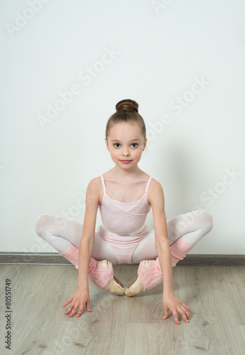 Fototapeta premium A little adorable young ballerina posing and stretching