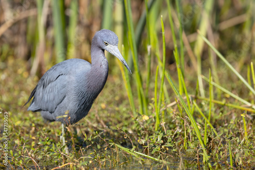 © Hayley Rutger, Naklejka premium A little blue heron (Egretta caerulea), a type of wading bird, walks through a green marsh in Sarasota County, Florida