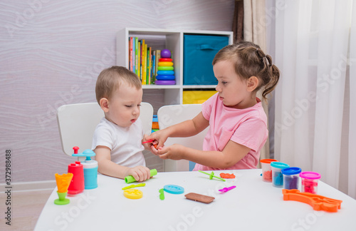 Fototapeta premium a little boy and girl play play-doh at a table in the children's room