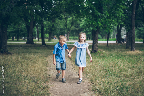 © phpetrunina14, Obraz premium A little boy and girl walking together and holding each other hands