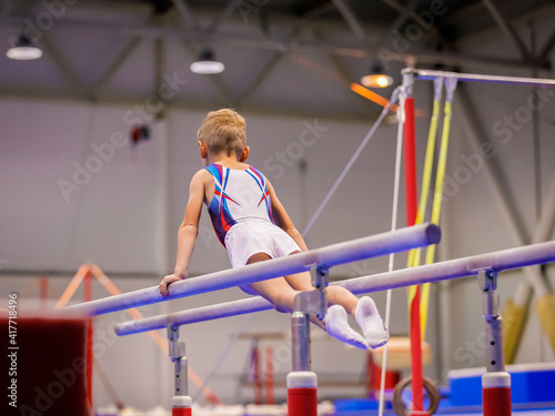 Naklejka premium A little boy in sportswear performs an exercise on the uneven bars. Rhythmic gymnastics, training in the hall.