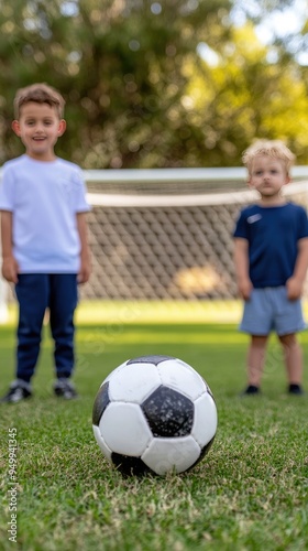 Fototapeta premium A little boy kicks a soccer ball while playing with his father on a colorful...