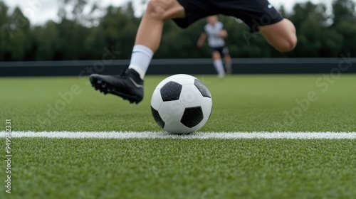 © lililia, Fototapeta premium A little boy kicks a soccer ball while playing with his father on a colorful football field, surrounded by autumn leaves, capturing joyful moments of outdoor fun