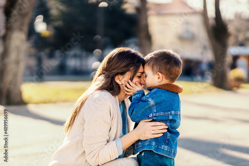 © Dusan Petkovic, Fototapeta premium A little boy kissing his mommy while she hugging him in a park.