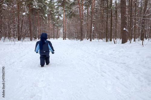 © Павел Круглов, Naklejka premium A little boy walks alone in the winter forest