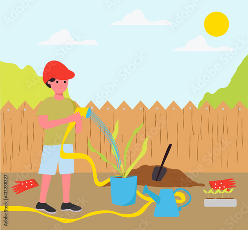 Fototapeta premium A little boy waters a plant in the garden with a watering hose, a boy in the...