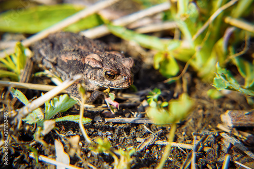 Fototapeta premium A little frog sitting on the ground. Hiding among the grass.
