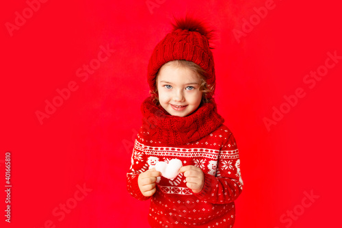 Fototapeta premium a little girl in winter clothes holds a heart on a red background. New year's...