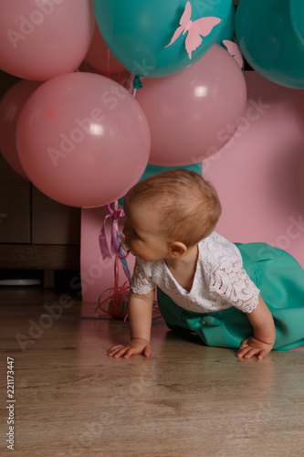 © Skripnik Olga, Obraz premium a little girl is sitting on the floor, on a pink background, near the balloons, with a pacifier. celebration. birthday, one year old. Little Girl with soother.