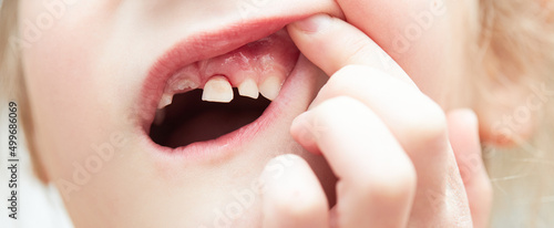 © oes, Fototapeta premium A little girl lost her baby milk tooth. Lost temporary tooth. The concept of oral hygiene in children. Close-up of the oral cavity