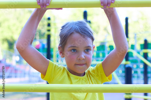 Fototapeta premium A little girl on the playground climbs the stairs.