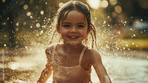 © Panyamethi, Obraz premium A little girl runs through a sprinkler in the garden