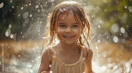 © visoot, Fototapeta premium A little girl runs through a sprinkler in the garden.