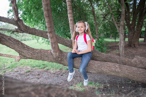 Naklejka premium a little girl sits on a tree in the woods, in the park. child and tree