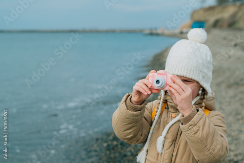 Obraz premium a little girl squinting photographs the autumn seascape on a childrens pink camera. the child is passionately engaged in his hobby: photography