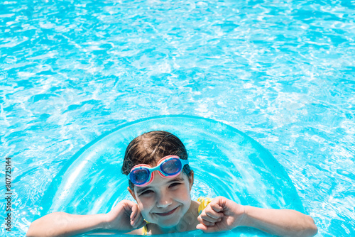 Fototapeta premium A little girl with an inflatable circle jumped into the pool. A cute kid in a...