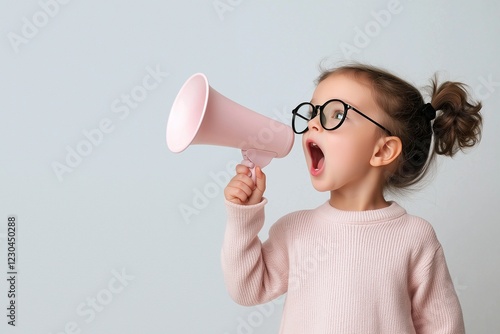 Naklejka premium A little girl with glasses and pink clothes, shouts loudly through a megaphone, child speaker.
