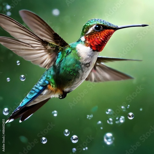 Fototapeta premium A little iridescent hummingbird flies with water droplets floating around it.
