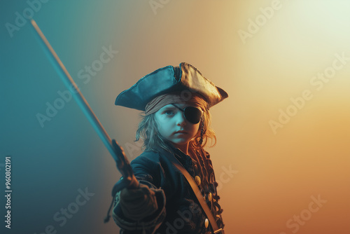 © Peffy's Photography, Obraz premium A little pirate with a hat, eyepatch, and toy sword, isolated on white background, Halloween, kids, trick or treat, spooky, festive