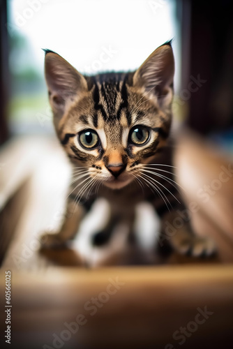 © Dushan, Obraz premium A little striped curious kitten is looking at the camera,Generative AI