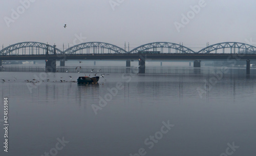 © Gints , Naklejka premium A little wooden fishing boat in the calm river who flow through big city. In the background stone bridge with traffic on it. Winter time.
