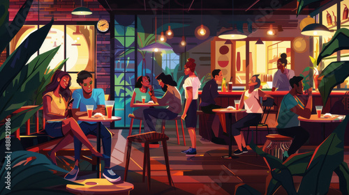 Fototapeta premium A lively evening at a café with friends of various ethnicities bonding over...