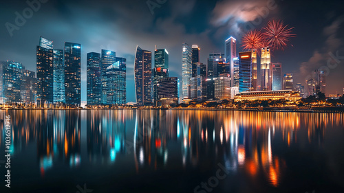 © Jhati, Naklejka premium A lively New Year's Eve in Singapore, with fireworks lighting up the skyline.