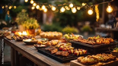 Fototapeta premium A lively outdoor barbecue party features a table filled with a variety of grilled meats and colorful sides. Warm lights hang above creating a cozy atmosphere during the evening.