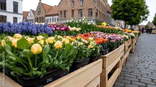 Fototapeta premium A lively spring market in Bruges, Belgium, with wooden stalls selling fresh...