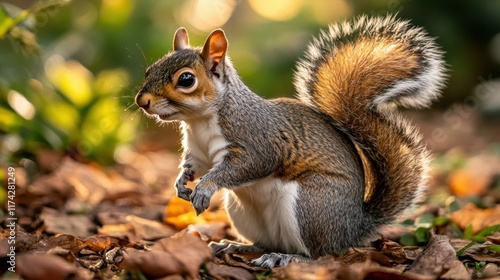 © RUENGWILAI, Obraz premium A lively squirrel poses amidst fallen leaves, showcasing its bushy tail and curious expression in a sunlit forest setting.