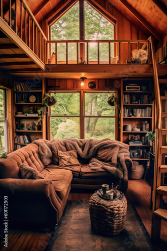 Fototapeta premium A living room filled with furniture and lots of windows. Tiny house, wooden cabin interior, generative AI.